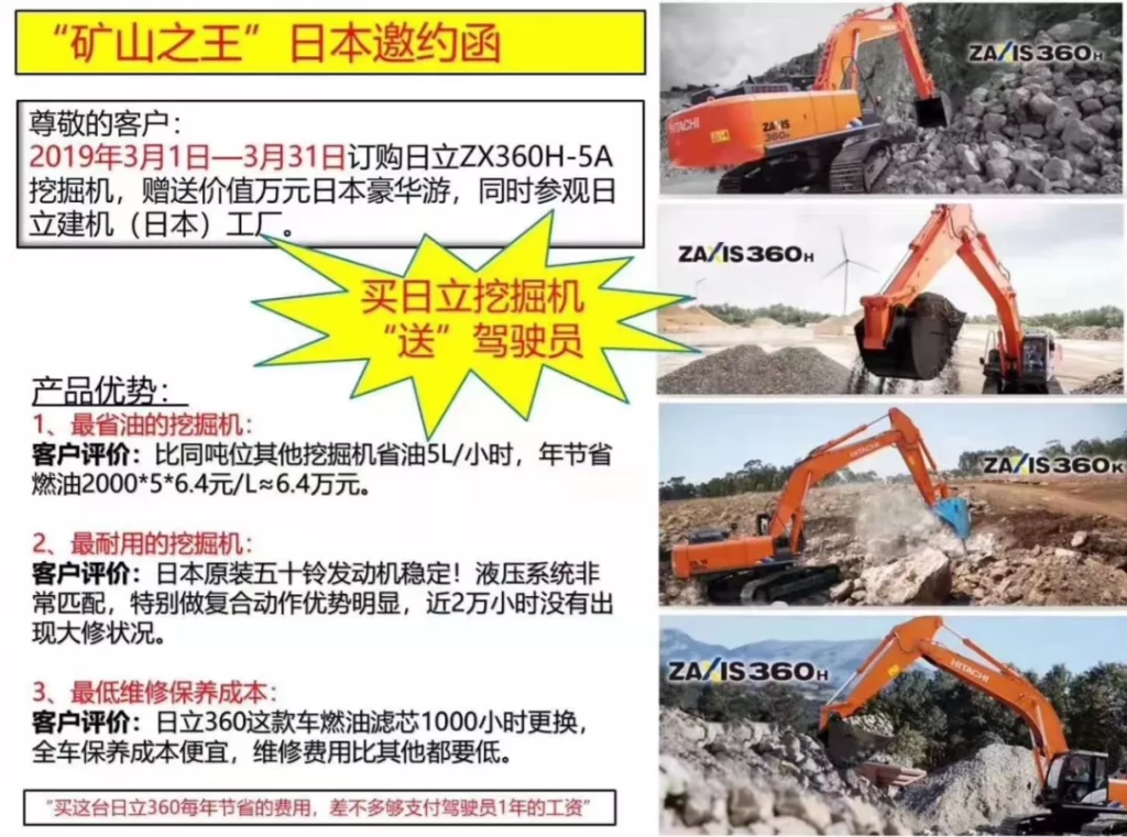 說(shuō)了這么多還是得您使用了才知道,即日起購買(mǎi)日立ZX360H-5A,重慶日和東浦邀請您去日本看櫻花,購買(mǎi)即送日本深度游一次,心動(dòng)不如行動(dòng)馬上聯(lián)系當地業(yè)務(wù)人員購買(mǎi)吧!